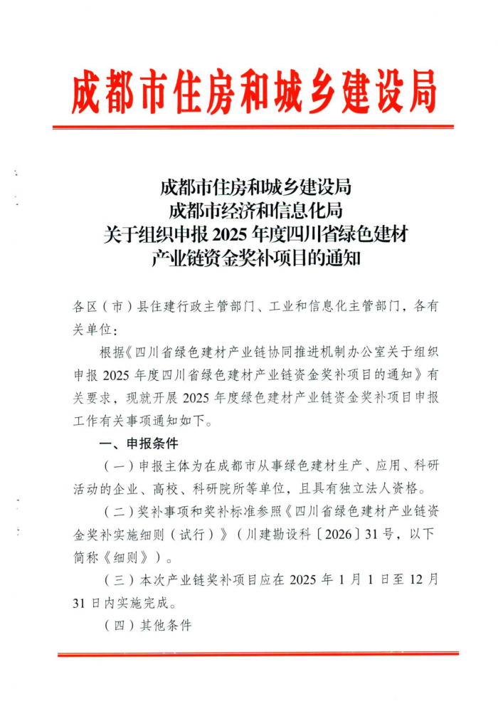 转发关于组织申报2025年度四川省绿色建材产业链资金奖补项目的通知